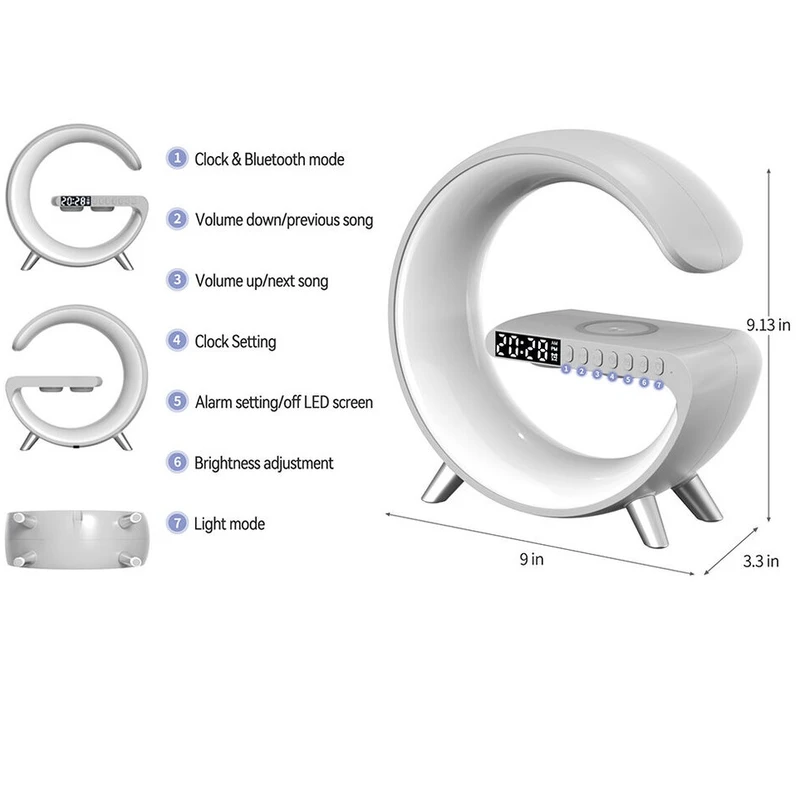 این گجت ۴کاره شامل اسپیکر بلوتوثی، شارژر وایرلس، ساعت دیجیتال و چراغ خواب RGB با قابلیت تنظیم شدت نور و رنگه.