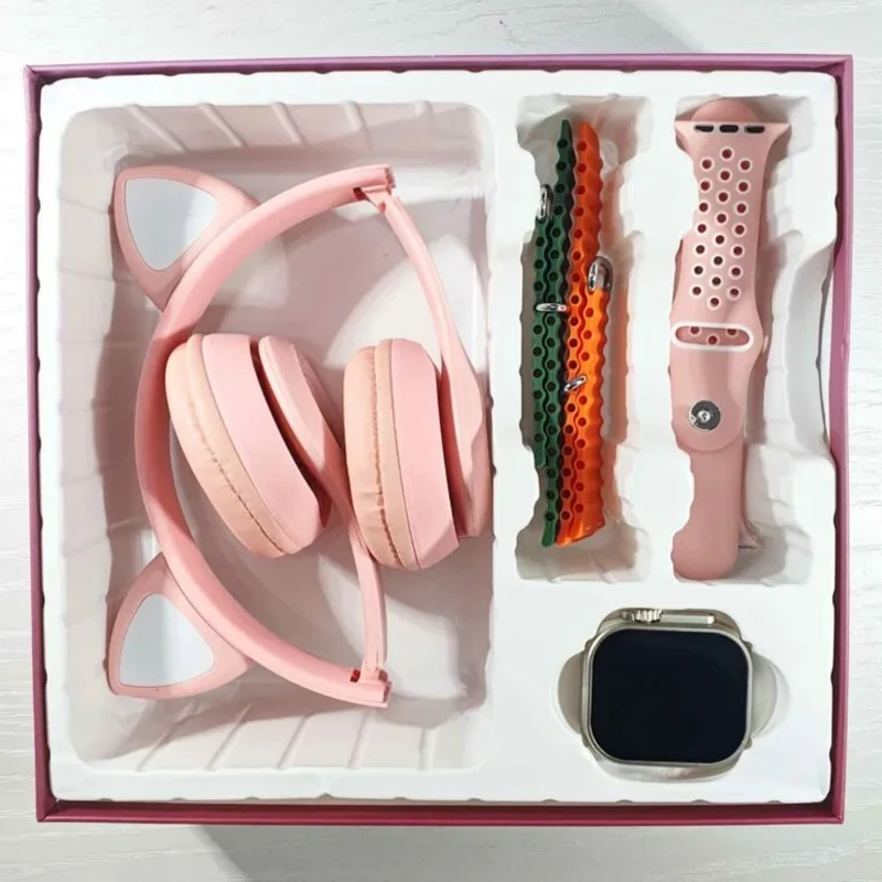 دارای صفحه نمایش رنگی و لمسی، فرم مستطیلی مشابه اپل واچ، و بند سیلیکونی نرم و قابل تعویض. مجهز به بلوتوث تماس مستقیم، نمایش اعلانها، کنترل موسیقی و دوربین گوشی، با پشتیبانی کامل از زبان فارسی. دارای سنسورهای پایه مثل گامشمار، پایش خواب، ضربان قلب، فشار خون و حالتهای ورزشی متنوع. پک هدیه شامل ۵ عدد بند متنوع و گاهی هدفون بلوتوثی همراه، مناسب برای آقایان، بانوان و نوجوانان.