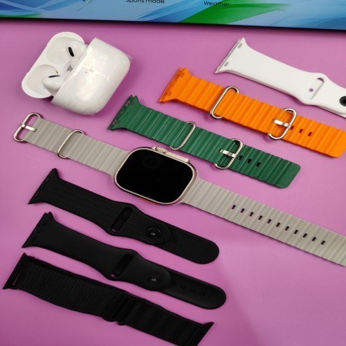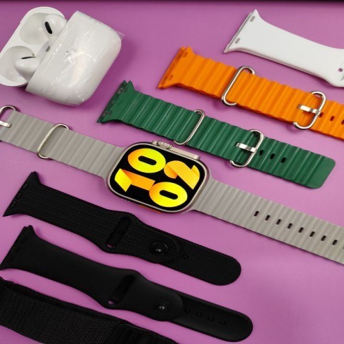دارای صفحه نمایش رنگی و لمسی، طراحی مشابه اپل واچ اولترا، و بند سیلیکونی قابل تعویض (همراه با ۸ بند اضافه). مجهز به بلوتوث تماس مستقیم، نمایش اعلانها، کنترل موسیقی و دوربین گوشی، با پشتیبانی کامل از زبان فارسی. دارای سنسورهای پایه مثل ضربان قلب، فشار خون، اکسیژن خون، پایش خواب، گامشمار و حالتهای ورزشی متنوع. پک محصول شامل ایرپاد بلوتوثی، شارژر وایرلس، و جعبه هدیه، مناسب برای استفاده روزمره، ورزشی و رسمی.
