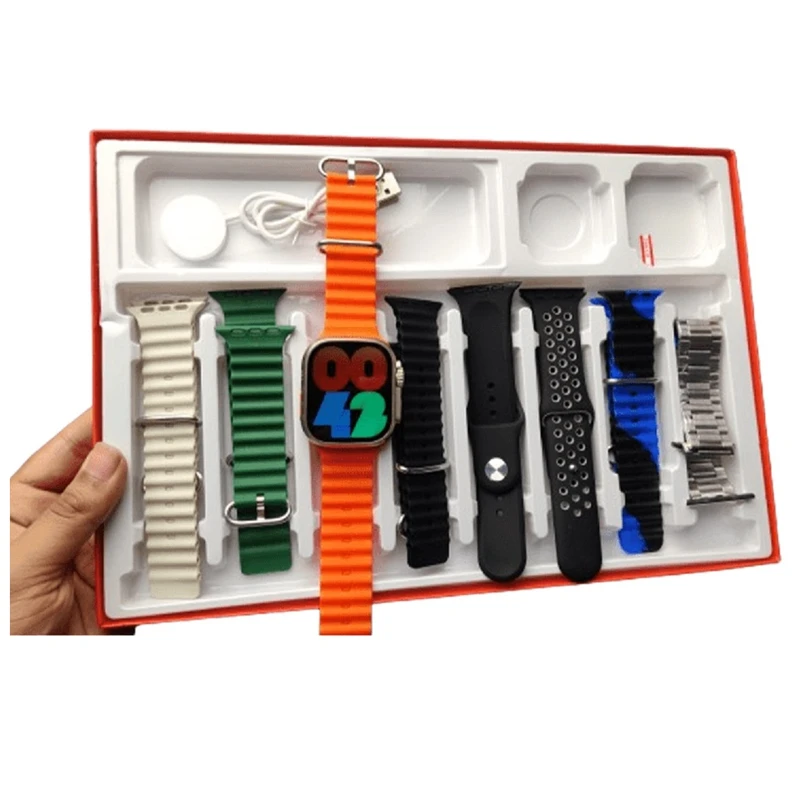 پک محصول شامل ۷ بند متنوع، شارژر وایرلس، و جعبه هدیه شیک، مناسب برای استفاده روزمره، ورزشی و رسمی.