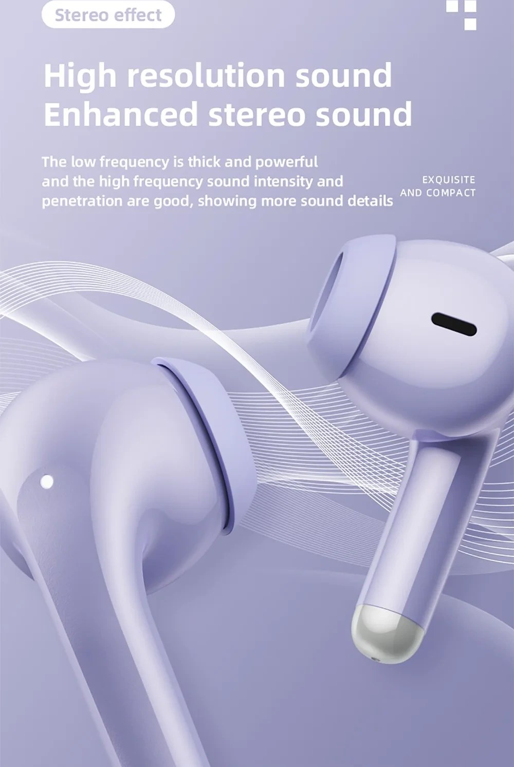 دارای طراحی داخلگوشی (In-Ear)، صدای استریو با بیس مناسب، و بلوتوث نسخه 5.3 برای اتصال سریع و پایدار تا ۱۰ متر.